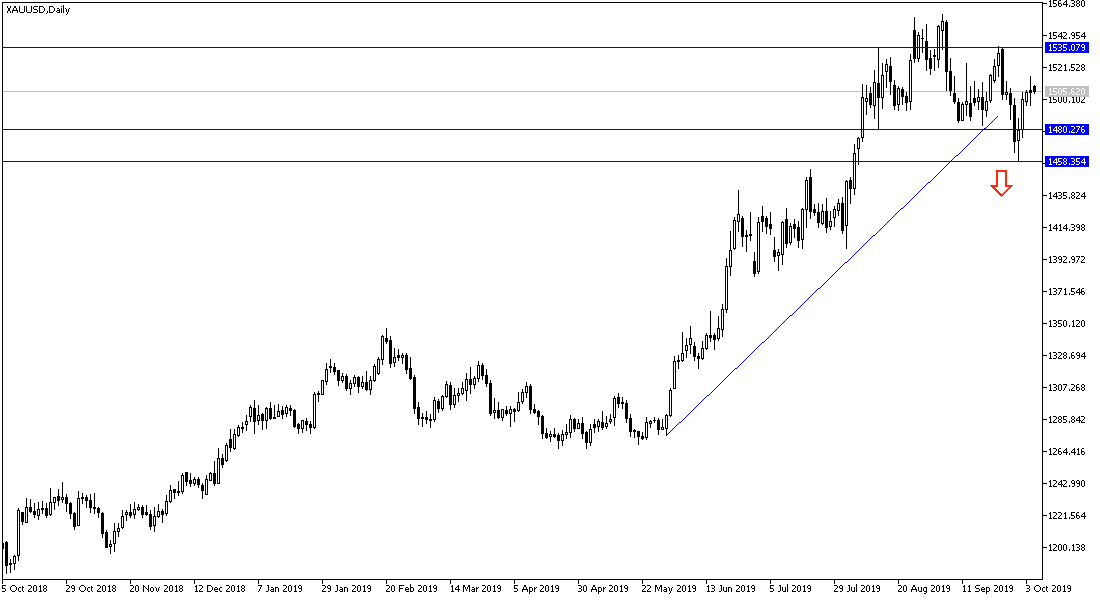 Last week's trading sessions were characterized by strong volatility of gold prices, as after Gold prices dropped to $1459, the lowest in almost 2 months, Gold purchases increased by investors to hedge against the renewed trade and political tensions around the world, which pushed gold prices to %1515 resistance during Friday's session, especially after the announcement of weak US jobs figures that negatively impacted the dollar and gave gold a new impetus to breach the $1500 psychological resistance. The mixed jobs data from the US Department of Labor increased the likelihood of a rate cut by the Fed and helped ease fears of a recession as well. It is well known that the relationship between the dollar and gold is inverse.