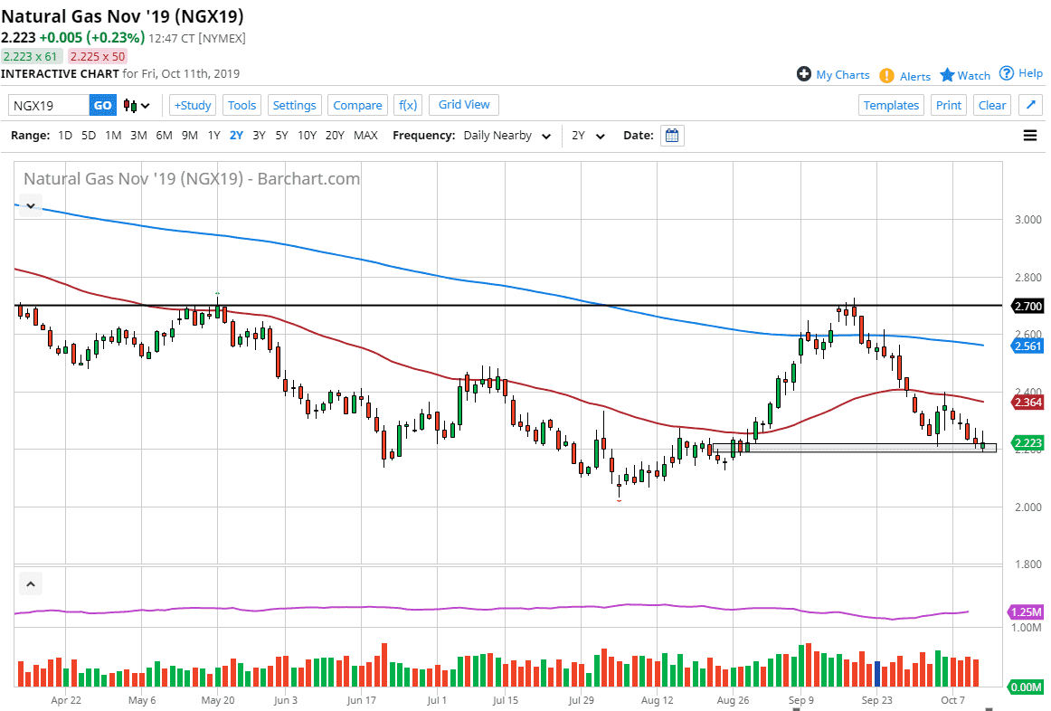 With all that being said, the market is likely to struggle in the short term, but if we can break above those tales for the last couple of days that would be an export nearly bullish sign. If we do break down below the $2.20 level, we could go as low as the $2.15 level. That being said though, I don’t have any interest in shorting this market because it would simply be “chasing the trade” at this point as we have fallen so far. Remember, anytime you get a trend change it is typically very messy and that’s exactly what we’ve seen lately.