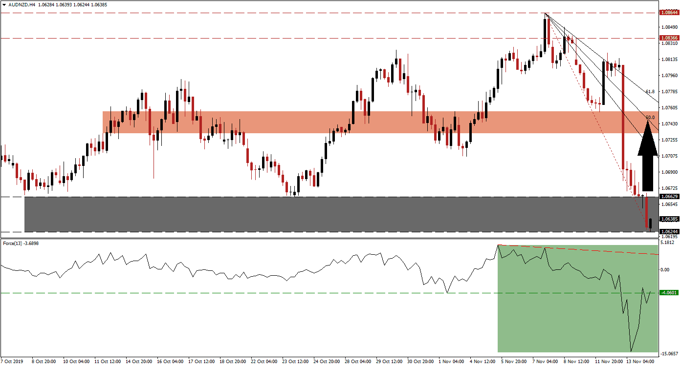 This currency started to stabilize inside its support zone, located between 1.06244 and 1.06629 as marked by the grey rectangle. Adding to the downside pressures which led to the sell-off was Chinese data which showed weaker than expected industrial production as well as retail sales and forex traders should now monitor the Force Index for a push above the 0 centerline which is expected to lead the AUD/NZD to the upside and close the gap to the Fibonacci Retracement Fan which developed due to the fast descend in price action.