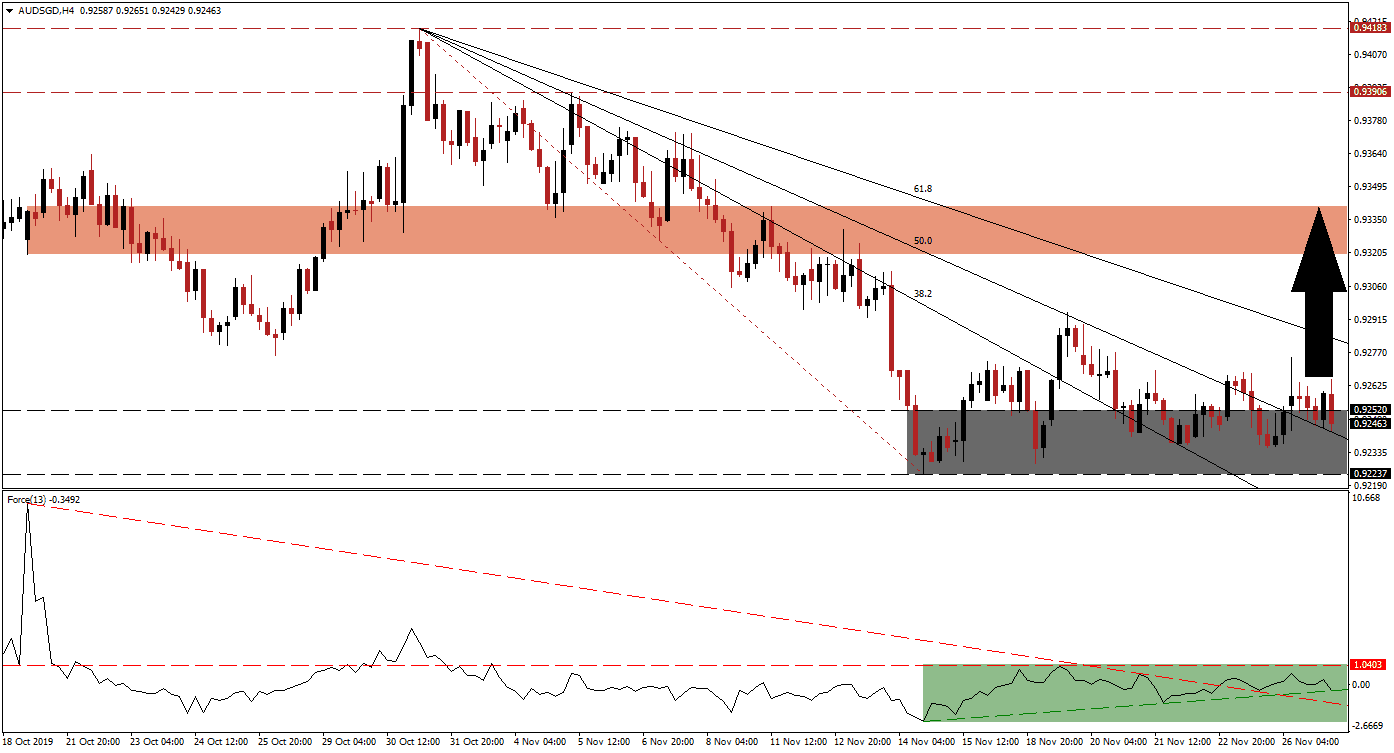 As the Hong Kong unrest continues and China labeled this weekend’s election result as manipulated by foreign actors, the positive impact on the Singapore Dollar appears to be fading. The AUD/SGD remained stuck at its support zone despite much-better-than expected annualized production data out of Singapore. Optimism about a phase one trade deal has supported the Australian Dollar, the top Chinese Yuan proxy currency, and price action has started to form a series of marginally higher lows inside its support zone. This currency pair is now on the verge of another breakout attempt.