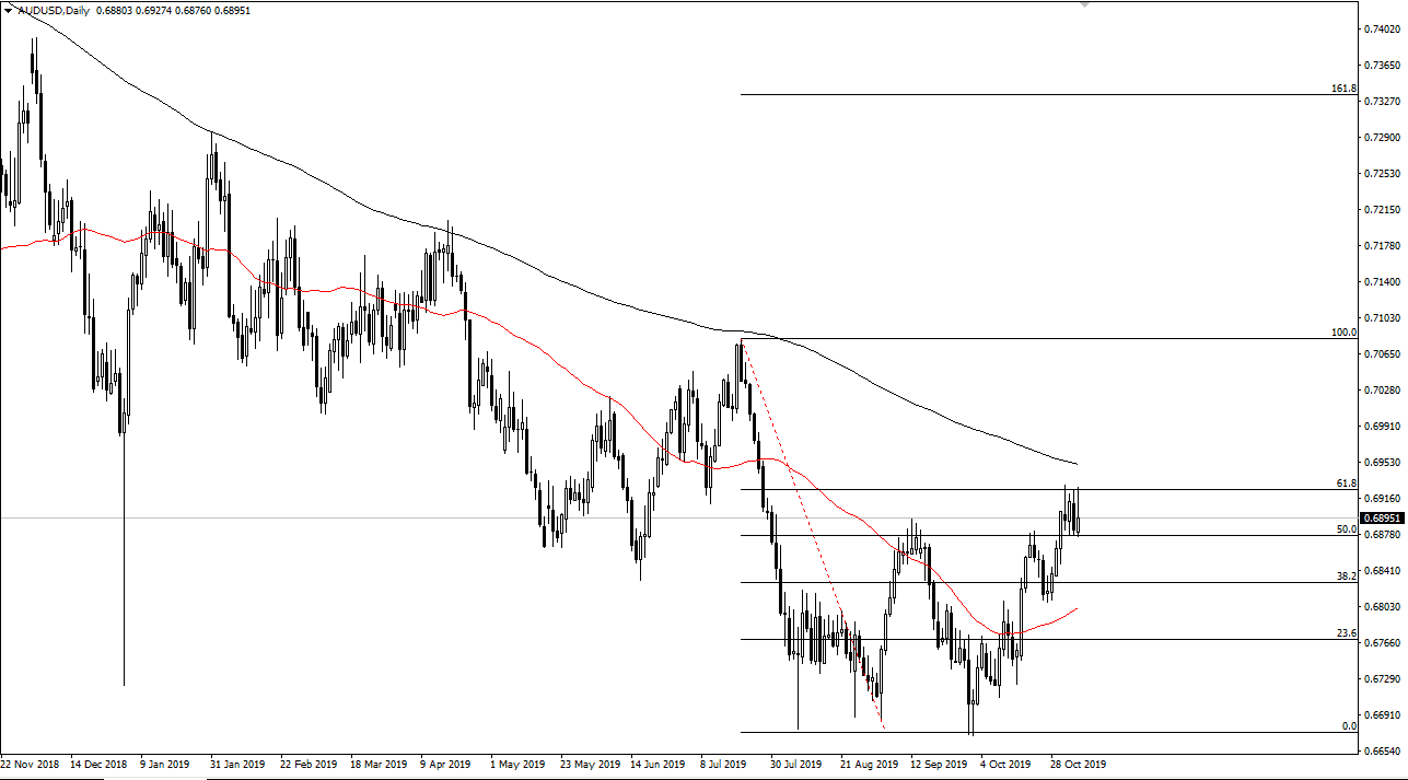 The 200 day EMA sits above and continues to offer a lot of resistance. The 61.8% Fibonacci retracement level is just below there, and it looks likely that traders will continue to short the market in that vicinity, unless of course something drastically changes. On the other hand, there is a lot of support at the 0.68 level underneath, which also features the 50 day EMA. If we were to break down below there, then the bottom would probably fall out and the Aussie would go back to the recent lows. I don’t think that’s the most likely thing though, as we are waiting to see whether or not the United States and China can pull it together. After all, the Australian dollar is highly sensitive to the Chinese mainland and of course the Chinese economy. Australia provides a significant amount of raw commodities to the Chinese for both manufacturing and construction, so any good news in the Chinese economy typically favors the Aussie dollar as well. If we did break to the outside though, the market is likely to go looking towards the 100% Fibonacci retracement level which is closer to the 0.71 handle.