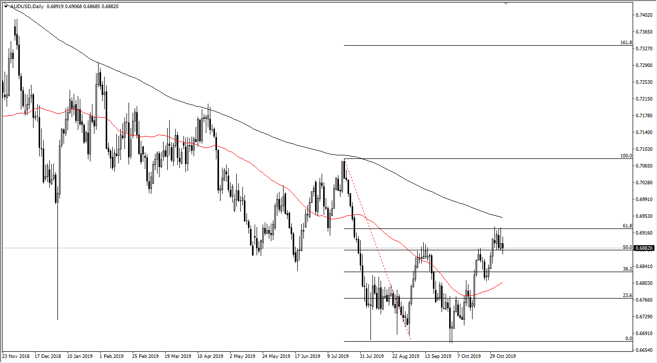 The Australian dollar continues to see a lot of noise in general, which makes quite a bit of sense considering just how noisy the situation has been in the Forex markets as of late. The Australian dollar is highly levered to the Chinese markets, which of course are being thrown around by the US/China trade situation. Ultimately, this is a market that is waiting to see what happens next, and during the day on Wednesday, we had seen a lot of noise around the US/China signing of “Phase 1.” This is causing a lot of problems in the market as it looks like the signing will be until at least December, and you would have to be rather gullible to think that it’s going to happen anytime soon anyway. At this point, this is a market that seems to be getting tossed around quite a bit, but at this point that should be nothing new.