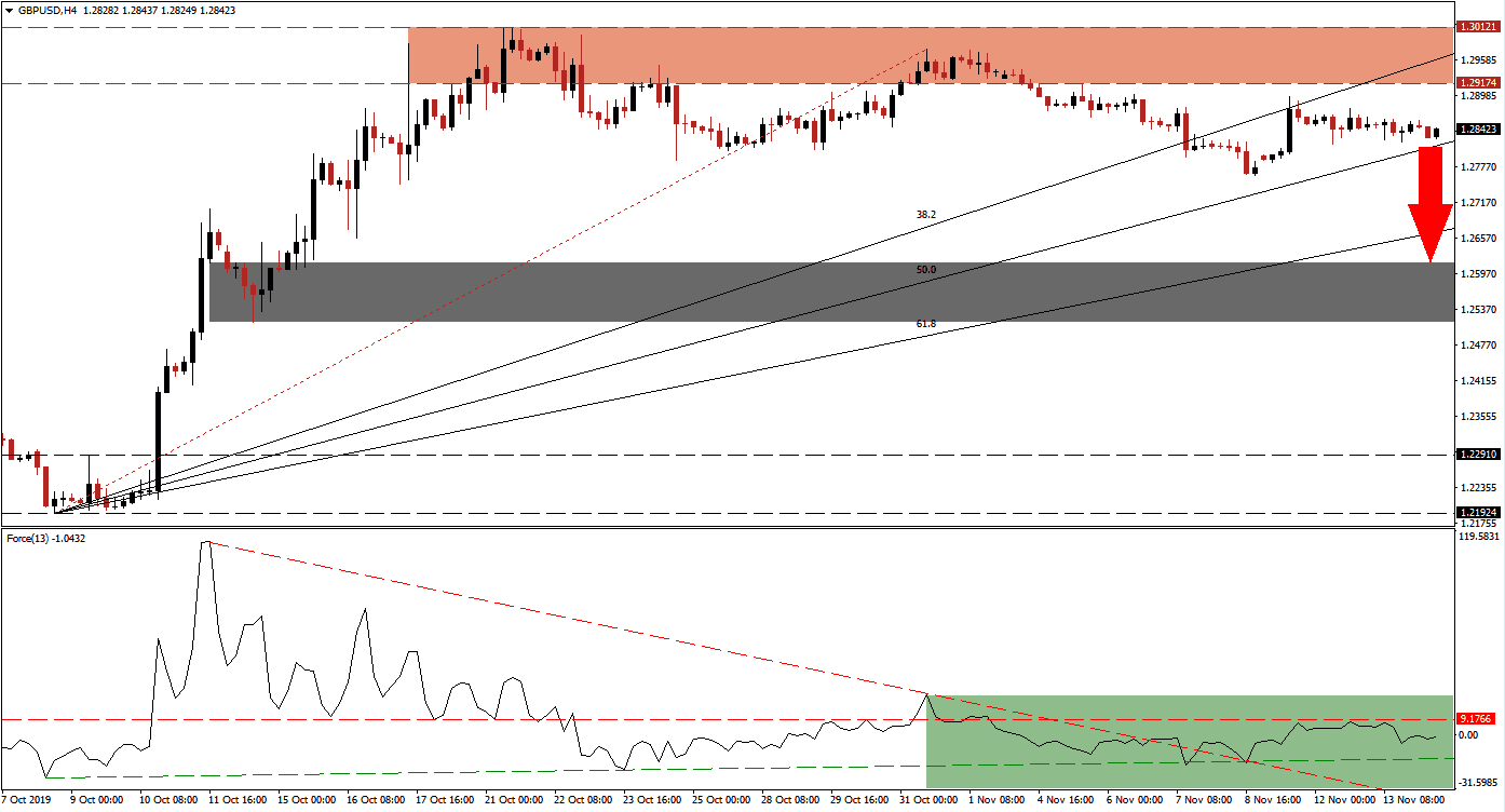 With the December 12th election approaching, UK Prime Minster Johnson’s Tories are expanding their lead in the polls. This has eased the risk of a no-deal Brexit and kept the British Pound well supported after a strong advance across the board, but bearish trading signals are appearing which suggests that a profit-taking sell-off my be brewing. The GBP/USD started to form a series of lower highs and lower lows following the first breakdown below its resistance zone; this led to a gradual increase in bearish pressures and made another breakdown likely. You can learn more about a resistance zone here.