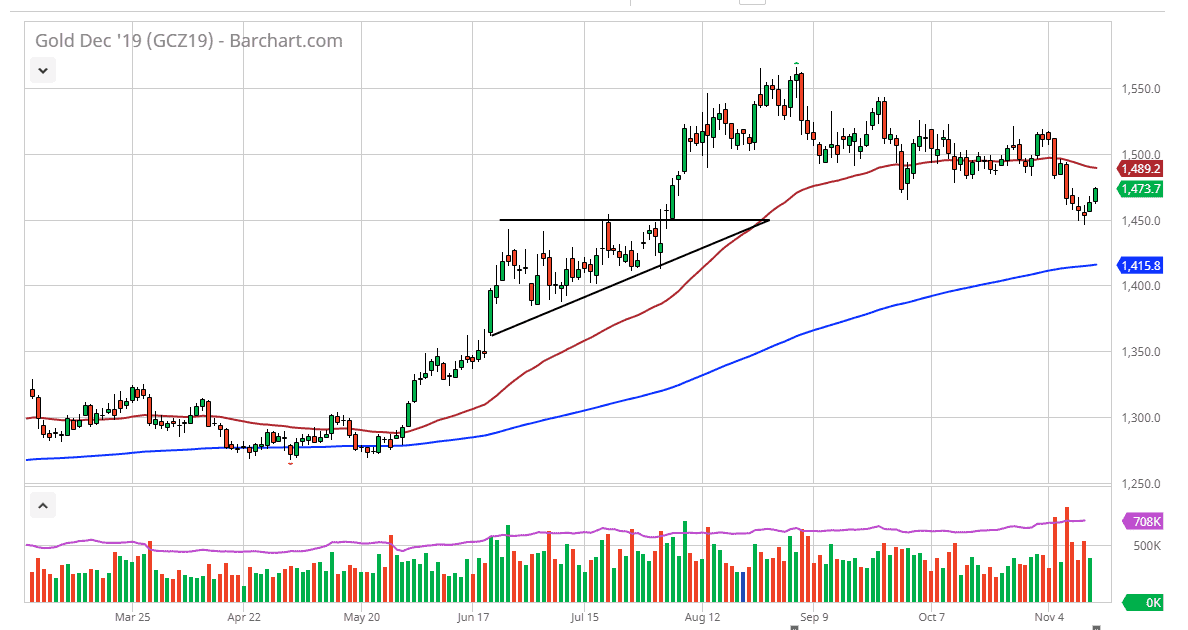 Gold markets have a good session on Thursday, breaking above the highs from the Wednesday session and continuing to go higher. The question now is whether or not we have seen the pullback should itself as gold had been so oversold in the short term. If you have been following these articles, you know that I had talked about how important the $1450 level was going to be, as it was the top of the ascending triangle that I have shown on the chart. With that being the case, the fact that we have held that level is very encouraging, but we are quite out of the woods yet.