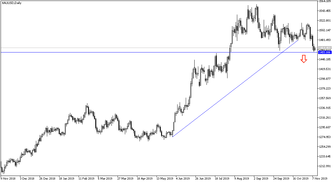 Even as doubts about the prospects of a formal trade deal between the United States and China return after President Donald Trump said he did not agree to cut tariffs on Chinese goods, gold prices continued to decline strongly to reach the $1456 support, the lowest in three months, and fell by 3.2% last week, the largest weekly decline since May 2017. The strength of the US dollar was the biggest contributor to the decline in gold, as the US index rose to 98.40 DXY. The relationship between the dollar and gold is inverse, and news that the United States and China are close to signing an agreement to stop tariffs on each other's goods has also contributed to the decline in gold.