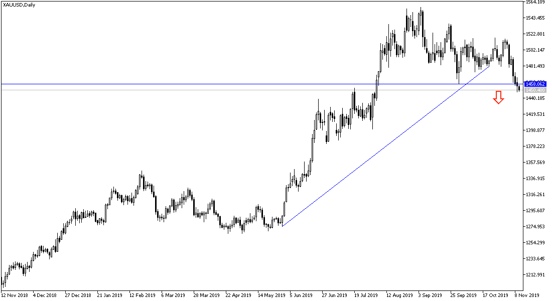 The yellow metal is still under downward pressure due to increased investors’ risk appetite and gains in global stock markets due to investors' optimism that a trade agreement between the United States and China will be signed soon. The gold prices suffered losses in early trading this week, falling to the $1448 support before settling around $1453 at the time of writing. Despite the uncertainty surrounding trade negotiations between China and the United States, traders continue to bet on stocks amid hopes that the world's two largest economies will soon reach an agreement.