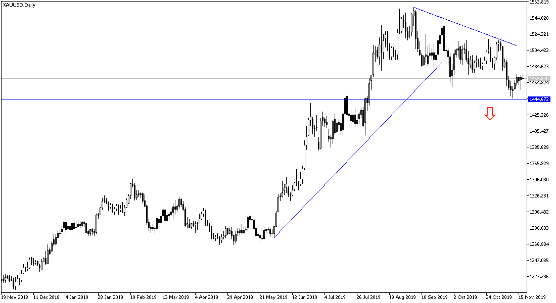The decline of the US dollar and weaker investor risk appetite pushed the price of gold to return to gains at the $1464 resistance after trying to drop at the beginning of this week's trading session to the $1456 support. US President Trump tweeted on Monday that his meeting with Fed Governor Powell was "very good and friendly." He added that they discussed "interest rates, negative interest rates, low inflation, easing, the strength of the dollar and its impact on manufacturing, trade with China, and other important issues. The Fed said Treasury Secretary Stephen Mnuchin also attended the meeting.