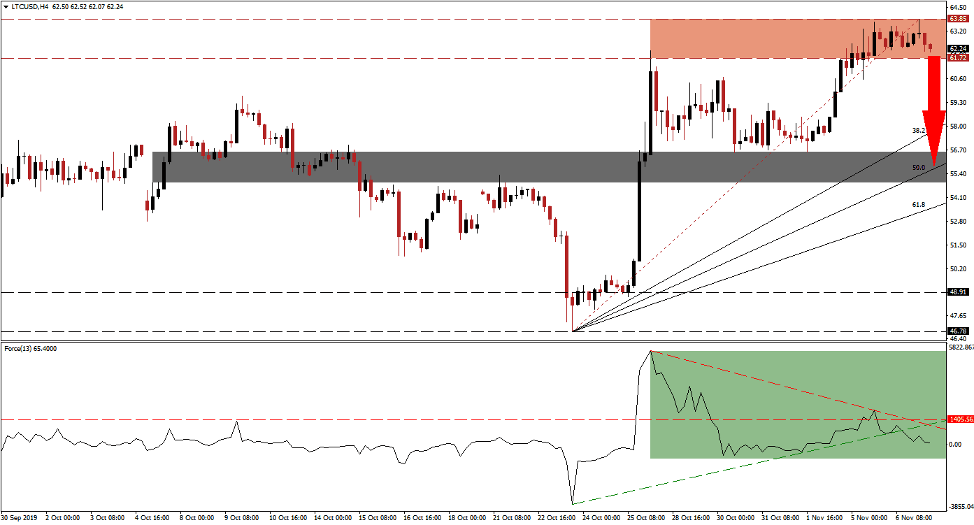 The Force Index, a next generation technical indicator, indicates the collapse in bullish momentum as price action has pushed to a higher; a negative divergence formed as a result which suggests that a correction should be expected. The Force Index completed a breakdown below its horizontal support level, turned it into resistance and was then reversed by its ascending support level. Upside was limited to its descending resistance level and this technical indicator has now moved below its ascending support level as marked by the green rectangle. This represents another bearish development and more downside is expected in the Force Index, a move into negative territory will place bears in charge of the LTC/USD.
