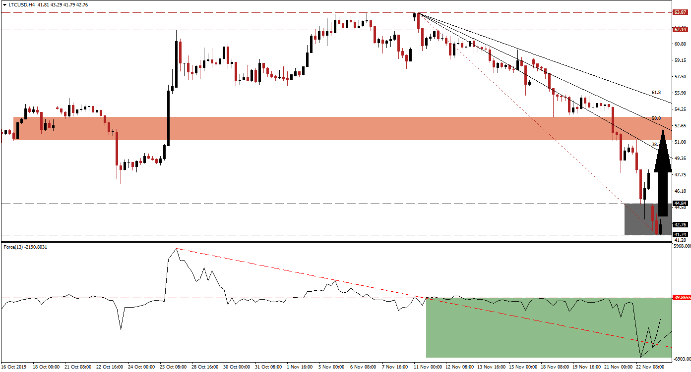 Should the Force Index reverse and complete a breakdown below its ascending support level, the LTC/USD may attempt a breakdown of its own. Downside potential remains limited and the next support zone awaits price action between 33.09 and 35.91 which would include the closure of a price gap to the upside. Any descend into this support zone represents an excellent long-term buying opportunity as long-term fundamentals favor a significant move to the upside.