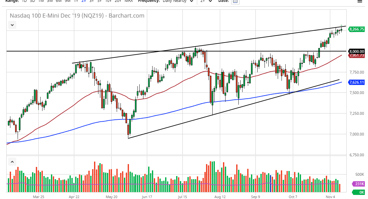 Looking at this chart, I like picking up value going forward, but I also recognize that if we break above the high from the trading session on Tuesday, then the market could continue to go higher. All things being equal, the market should continue to reach towards the 8500 level, possibly even the 8800 level after that. Based upon the ascending triangle underneath, the market was looking very likely to go to the 8800 level, and quite frankly there’s nothing on this chart to suggest that it wasn’t going to happen. I have no interest in shorting, I simply look at selloffs as an opportunity to pick up the market and take advantage of value. The market has gotten a little bit ahead of itself, so a pullback makes plenty of sense. In the environment that we are in, it makes sense that we may see some type of drift lower, but I will be looking to pick it up, not try to get cute and short it.