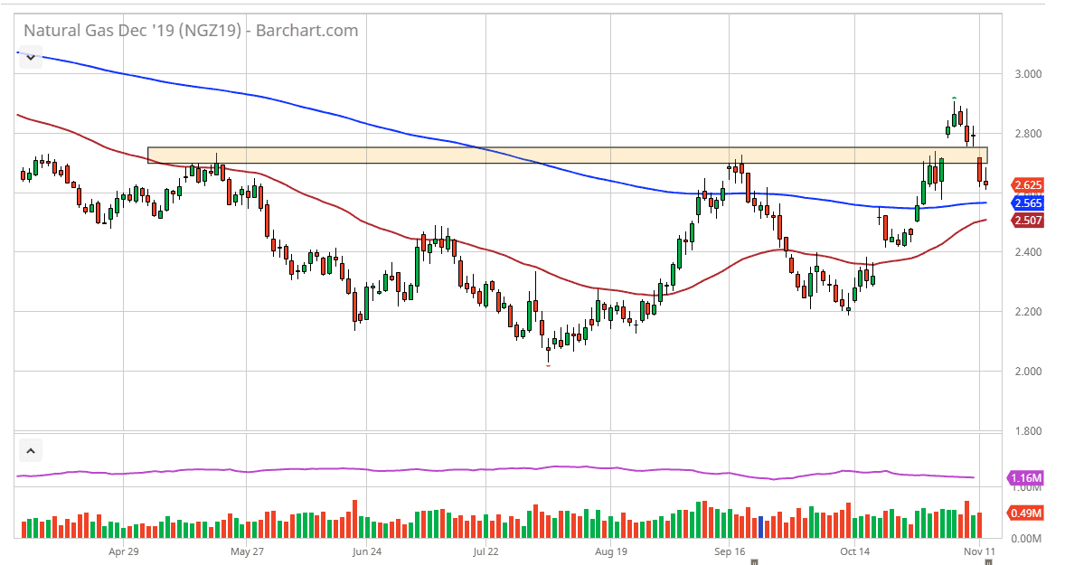 The natural gas markets initially tried to rally during the day on Tuesday but found enough resistance near the gap just above, and that shows that there could be a significant amount of selling pressure just above. At this point, the market is very likely to find sellers in that general vicinity, but I think it’s only a matter of time before we break out to the upside. This is the right time a year to see significant bullish pressure to the upside, but it takes a while to see this market break out above the gap just above. Once we do get that though it’s very likely that the market will reach towards the $2.90 level, and then possibly the $3.00 level.