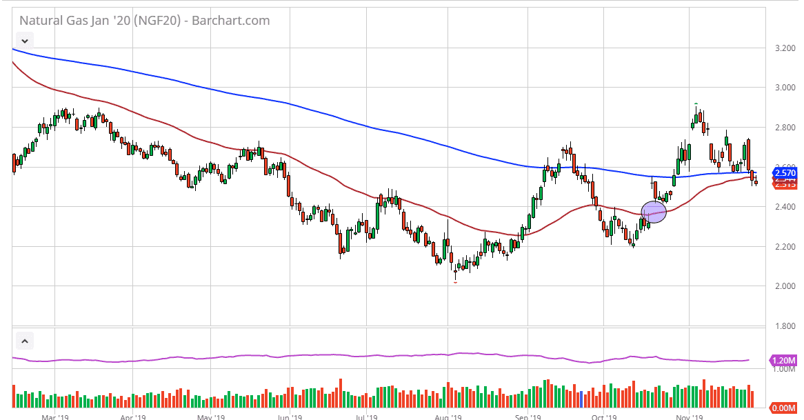 The natural gas markets are falling in the midst of a major winter storm in the United States, mainly because there are whether reports that perhaps December might be warmer than expected. That being said, it’s only a matter of time before it gets cold again, and we start to see the market go much higher. The gap underneath should continue to offer a lot of support, and I find it interesting that if you draw an uptrend line at the bottom of what could be an uptrend and channel, it should in the general sense show up at about the same price level. At this point, the market then could bounce based upon the fact that it is awfully cheap this time of year, simply because we had over drilled in the United States, offering a massive amount of bearish pressure. That being the case though, the oversupply is going to continue to be a scenario that will be worked through eventually.