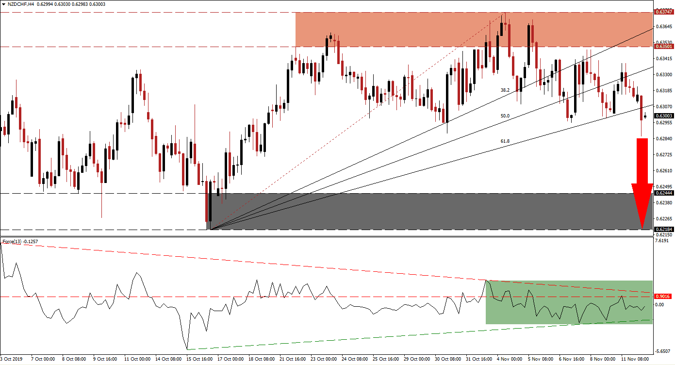 The Force Index, a next-generation technical indicator, started to contract after price action initially moved into its resistance zone; this led to a breakdown below its horizontal support level and turned it into resistance. Since then, the Force Index has been confined to a narrow trading range below its converted horizontal resistance level and its ascending support level as marked by the green rectangle. This technical indicator is trading in negative conditions which place bears in charge of price action and its descending resistance level is applying additional downside pressure. A breakdown in the Force Index below its ascending support level is expected to lead the NZD/CHF to the downside.