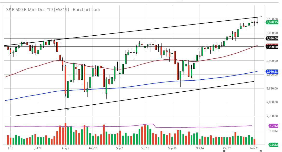 Looking at this market, we are at the top of the channel so it would make a certain amount of sense that we would struggle to go higher. However, if we were to break above the top of the shooting star the market could break out in more of an impulsive type of move. I don’t expect that, but it is a possibility. Pullbacks at this point that show supportive looking candles should offer plenty of opportunities given enough time. I think at this point the NASDAQ 100 will be extraordinarily sensitive to the US/China trade situation, which is in theory going a little better than it had, but at this point it’s likely that the headlines will continue to throw this market around. Longer-term it still looks like it’s bullish though so keep that in mind when trading. Short-term buying the dips probably will be the best way going forward with an eye on the 50 day EMA as a bit of a “floor” in the market.