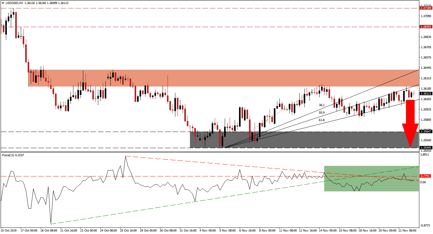 Price action halted its move to the downside after reaching its ascending 61.8 Fibonacci Retracement Fan Support Level. The rejection which led to the descend was initiated after the USD/SGD failed at its fifth breakout attempt above its short-term resistance zone located between 1.36208 and 1.36420 as marked by the red rectangle. This currency pair drifted back into this zone inside a widening cone created by the 61.8 Fibonacci Retracement Fan Support Level and the 50.0 Fibonacci Retracement Fan Resistance Level; the latter has now entered the short-term resistance zone. You can learn more about the Fibonacci Retracement Fan here.