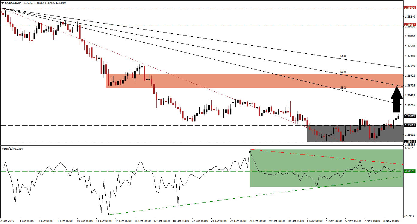 Capital inflows to Singapore as a result of the ongoing Hong Kong unrest continue to support the economy while the US prints mixed economic reports with a bearish bias. The breakout in the USD/SGD is expected to run out of bullish momentum once it reaches its short-term resistance zone which is located between 1.36651 and 1.36955 as marked by the red rectangle; the 50.0 Fibonacci Retracement Fan Resistance Level is on the verge of a move below this zone with the 61.8 Fibonacci Retracement Fan Resistance Level approaching the top range of it. This will keep the long-term downtrend intact and a breakdown sequence is likely to lead to more downside.