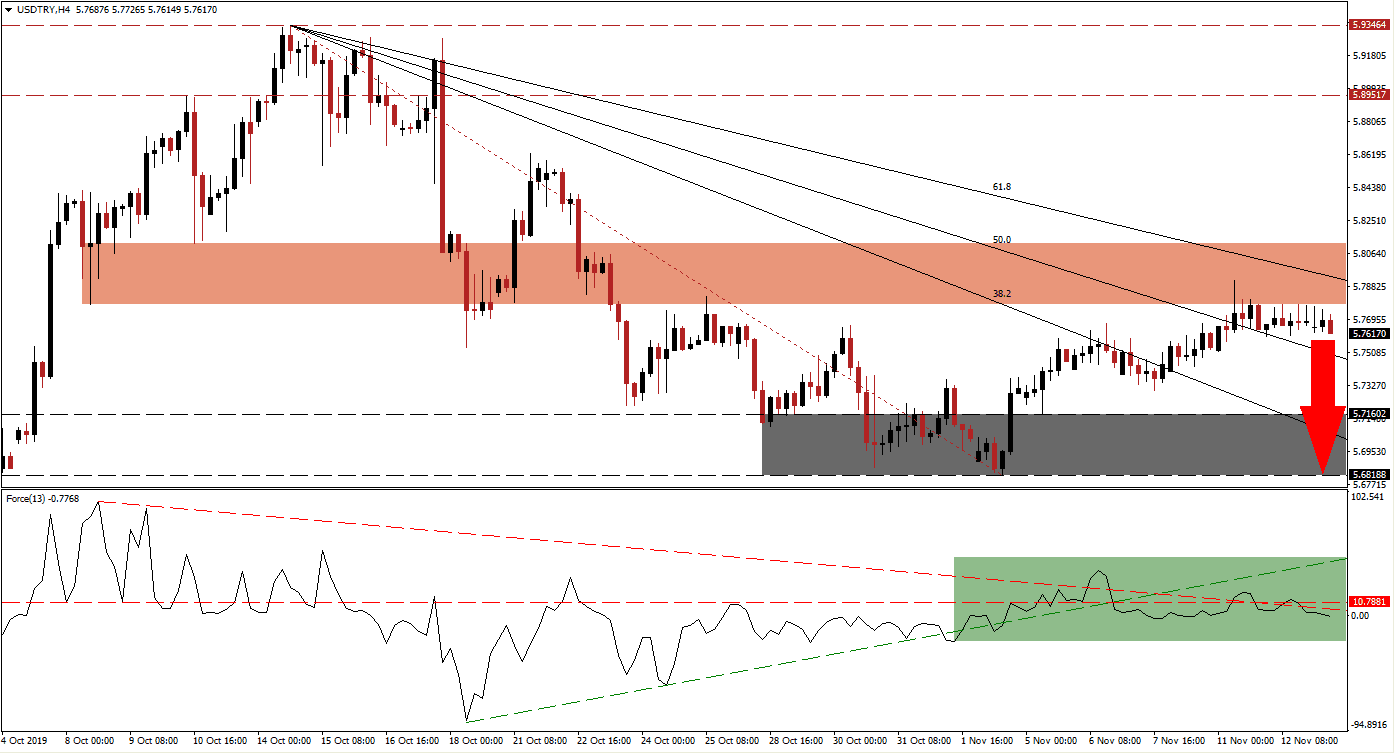 The Force Index, a next-generation technical indicator, offered another red flag through the emergence of a negative divergence; a bearish trading signal which indicates that a directional change in price action should be expected. After the USD/TRY reached its short-term resistance zone, the Force Index completed a breakdown below its horizontal support level and converted it into resistance. The breakdown was extended below its descending resistance level and into negative territory as marked by the green rectangle and more downside in this currency pair is expected to follow with bears in charge of price action.