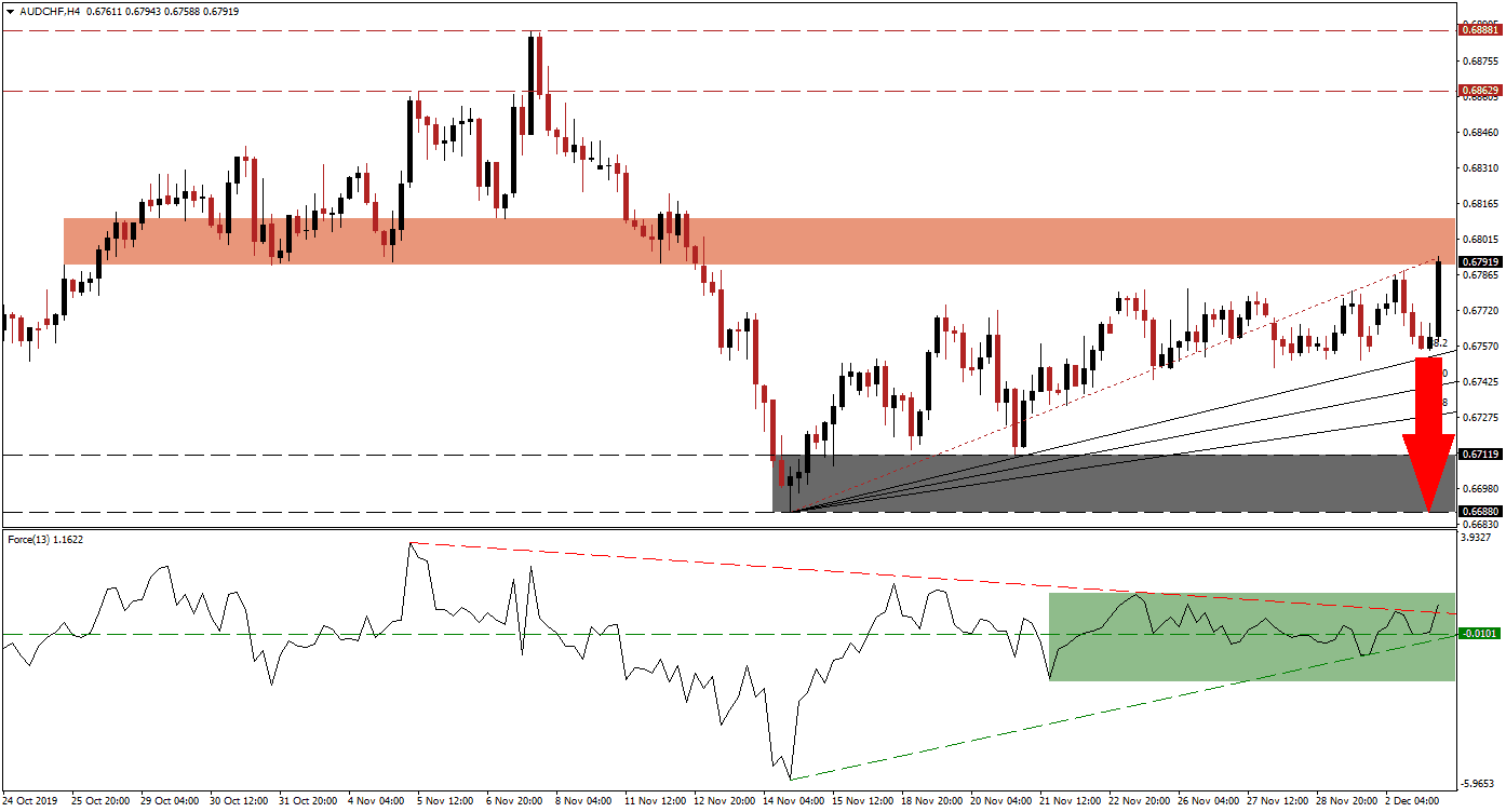 With the global manufacturing sector in a recession, economic risks remain and they stretch beyond the US-China trade war. The Swiss Franc initially came under pressure last week after commentary from the SNB in regards to a potential interest rate cute deeper into negative conditions, but GDP data came in better than expected and the SNB is expected to remain on the sidelines. The AUD/CHF is expected to retrace its advance and descend back into its support zone, located between 0.66880 and 0.67119 as marked by the grey rectangle. Such a move would take it below its entire Fibonacci Retracement Fan sequence. You can learn more about the Fibonacci Retracement Fan here.