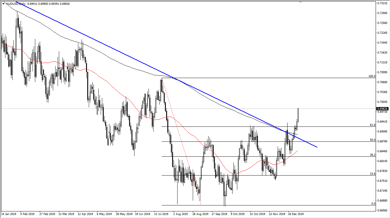 Looking to the chart, you can see that the candlestick for the day is closing at the very highest, and that normally means that we get a bit of follow-through. That being said though, we get a short-term pullback and be more than willing to buy this market, as we have clearly changed the overall attitude. This market will continue to have a lot of headline risk, but I look at pullbacks as buying opportunities as the US/China trade situation gets better, and at the very least it seems like it is going to calm down a bit. That being said, the market has it move that much per day so there are still plenty of opportunities if you are patient enough. For myself, I would like to see something to the effect of a 50 PIP pullback that I can take advantage of. That would roughly send the market back down to the 61.8% Fibonacci retracement level to retest it for support. Longer-term I expect the market to go towards the 100% Fibonacci retracement level, and even further than that given enough time. We are in the midst of a trend change, and these things are almost always messy and difficult. I have no interest in shorting the Aussie dollar unless something significant happens between the Americans and the Chinese.