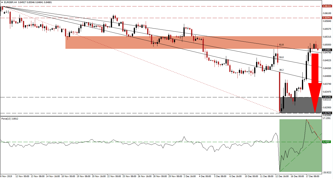 A breakout in the Force Index above its descending resistance level may pressure the EUR/GBP into a breakout attempt of its own. Due to the long-term fundamental outlook, supported by technical developments, the upside potential remains limited to its next long-term resistance zone. Price action will face this zone between 0.85943 and 0.86332, which represents a great short-selling opportunity.