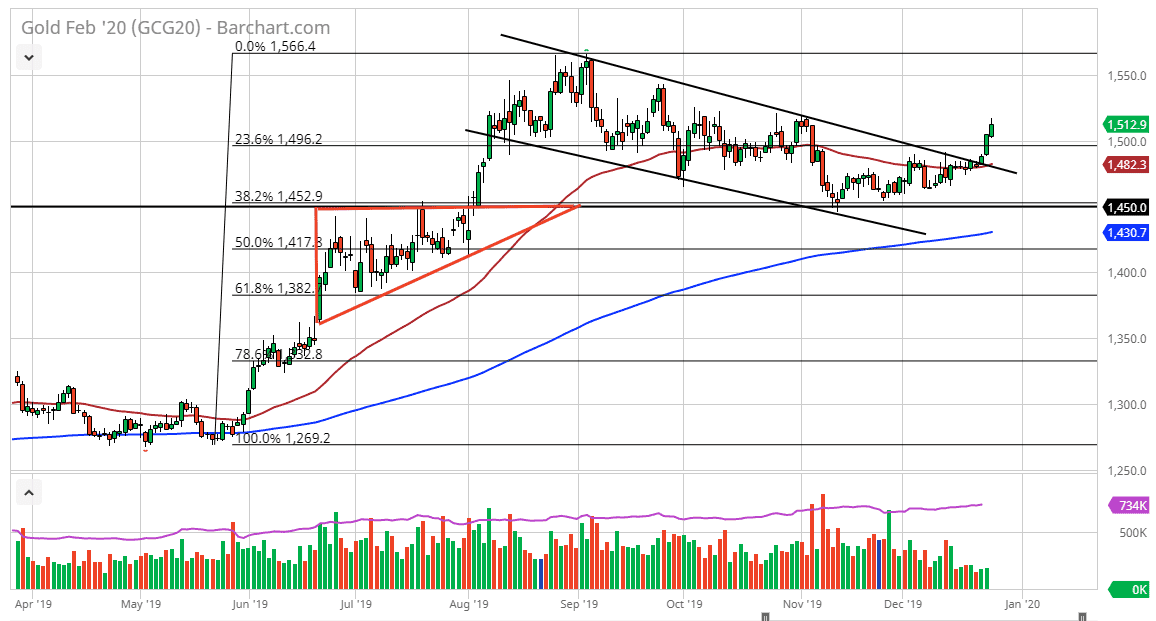 When I look at the chart, the 50 day EMA has offered dynamic support and is starting to curl higher. Beyond that, we have also broken above the $1500 level which of course is a bullish sign. The $1500 level will have a certain amount of psychological significance attached to it as it is a large, round, psychologically significant figure. All things being equal, now that we are above the $1500 level, I would anticipate that it should offer support. A pullback from here makes quite a bit of sense and it’s likely that the buyers will return based upon value. We have clearly broken out of the descending channel, and the entire world knows this. Beyond that, the pullback that we have seen to the $1450 level suggests that the market looks at that as a “floor” longer-term now, especially considering that it with a 38.2% Fibonacci retracement level. At this point, this is a market that should continue to find plenty of interest, and now that we are going to have more volume in a week or so, that should supercharge this market and have it running towards the upside longer term. With interesting is that many people thought that gold was moving based upon the US/China trade situation, but it also is getting a boost for central banks around the world being very loose monetarily.