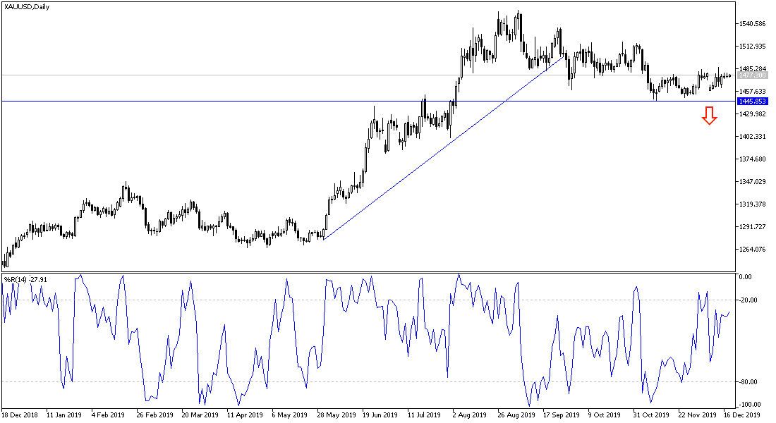 Since the beginning of this week’s trading, and the failure of establishing above $1480 resistance, makes the narrow trading in a limited range, the best description of gold price performance, which motivates investors of the yellow metal to push prices towards $1500 psychological resistance. The markets seem to be awaiting the announcement of the Phase 1 Agreement details, which aims at resolving the trade dispute between the United States and China, and if it came in better than what the markets expect, investors will increase their risk appetite, which will be negative for gold, especially if it also shows a timetable with clearer details to end that trade war, which hampers the global economy as a whole.