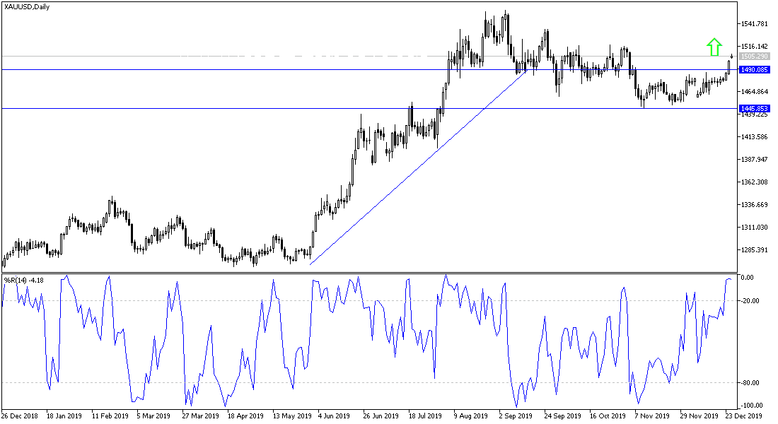 With the return from the Christmas holidays, the gold prices stabilized above the $1500 psychological resistance, and rose more to $1505, its highest level in more than a month and a half. We noted since the middle of this month, that there is an upcoming price explosion for the price of the yellow metal after several trading sessions of gold being stable around very narrow ranges. Despite the rebound, it should be borne in mind that announcing the date of the formal signing of the Phase1 trade agreement between the United States and China, and the details of the deal, will negatively affect the recent gold gains.