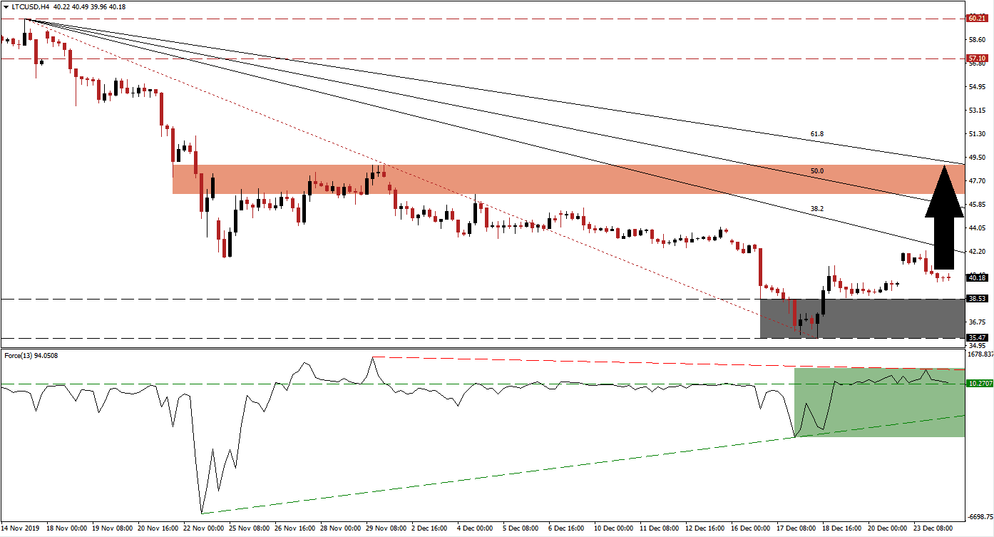 With the broad bearish sentiment across the cryptocurrency market intact, traders should remain careful as volatility is anticipated to increase. The breakout in the LTC/USD above its support zone, located between 35.47 and 38.53 as marked by the grey rectangle, included a price gap to the upside. A pause in the advance followed as this cryptocurrency pair approached its descending 38.2 Fibonacci Retracement Fan Resistance Level, but a second push higher is favored. You can learn more about a price gap here.