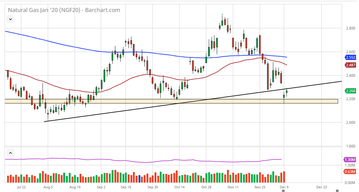Looking at this chart, if we can break above the $2.40 level it makes quite a bit of sense that we go higher from there. This is action that has been a bit negative due to the fact that the weather report suggests that the temperatures in December will be warmer than usual. If that’s going to be the case, then it’s likely that the natural gas markets will continue to face a bit of bearish pressure, but ultimately it’s only a matter of time before we see some type of cold weather in the forecast that will send this market higher. We are at extreme lows, and it’s likely that we will bounce given enough time.