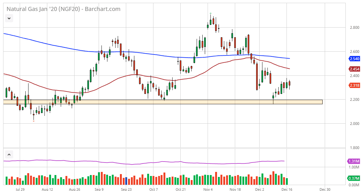 Looking at the longer-term chart, the $2.20 level should be massive support, and therefore it’s difficult to imagine breaking down through there, but if we were to reach towards that area, I would be all over the idea of buying a short-term bounce. If we can break above the $2.60 level, then we could be looking at a move back to the $3.00 level. The natural gas markets are very sensitive to the weather, and those reports do change quite often. That being said though, this is the time a year where we get more demand for natural gas of typically, I’m a buyer and not a seller. I recognize that the situation for suppliers in the United States has been horrible this year, mainly because the Americans had increased drilling by 17% in 2019. Having said that though, we have had a couple of winter storms and it looks like more cold weather could be coming. If that’s the case, we could be building up pressure for a move to the upside.