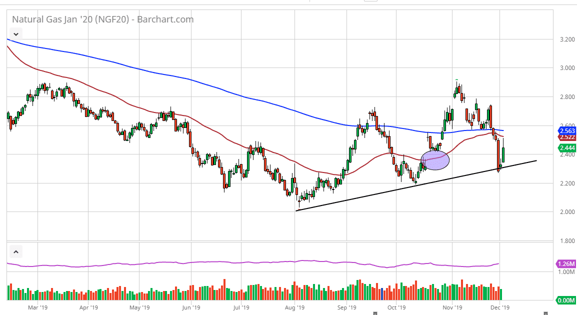 The market should continue to be technically driven as well, as we have just filled a gap on Friday, and now have bounce from there. By doing so, it looks very likely that we are going to continue to see buyers underneath and quite frankly this time a year is normally quite bullish. Overall, this is a market that should continue to find interest in the short term, as colder temperatures will undoubtedly drive up demand and decrease supply. That being said, we also have some resistive action just above at the moving averages, and we did in fact pull back from there. I do think that eventually we grind higher and short-term dips will offer buying opportunities after this action. This is a market move that should have been somewhat forecasted, but now if we can break above the moving averages just above, the 50 day and the 200 day EMA, then I think that we will go looking towards the $2.80 level and then eventually the $3.00 level.