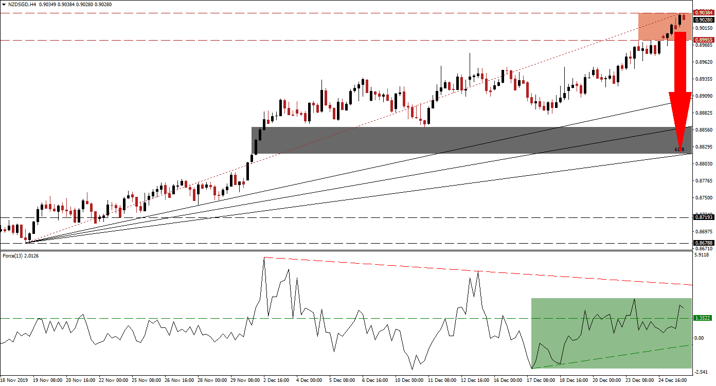 The Force Index, a next-generation technical indicator, confirmed the advance in this currency pair as it recovered from its lows and converted its horizontal resistance level into support. The Force Index additionally moved into positive conditions, suggesting bulls are in charge of the NZD/SGD while an ascending support level materialized. Its descending resistance level is anticipated to end the advance and increase bearish pressures, as marked by the green rectangle. A reversal in this indicator below the 0 center-line is favored to initiate a sell-off in price action.