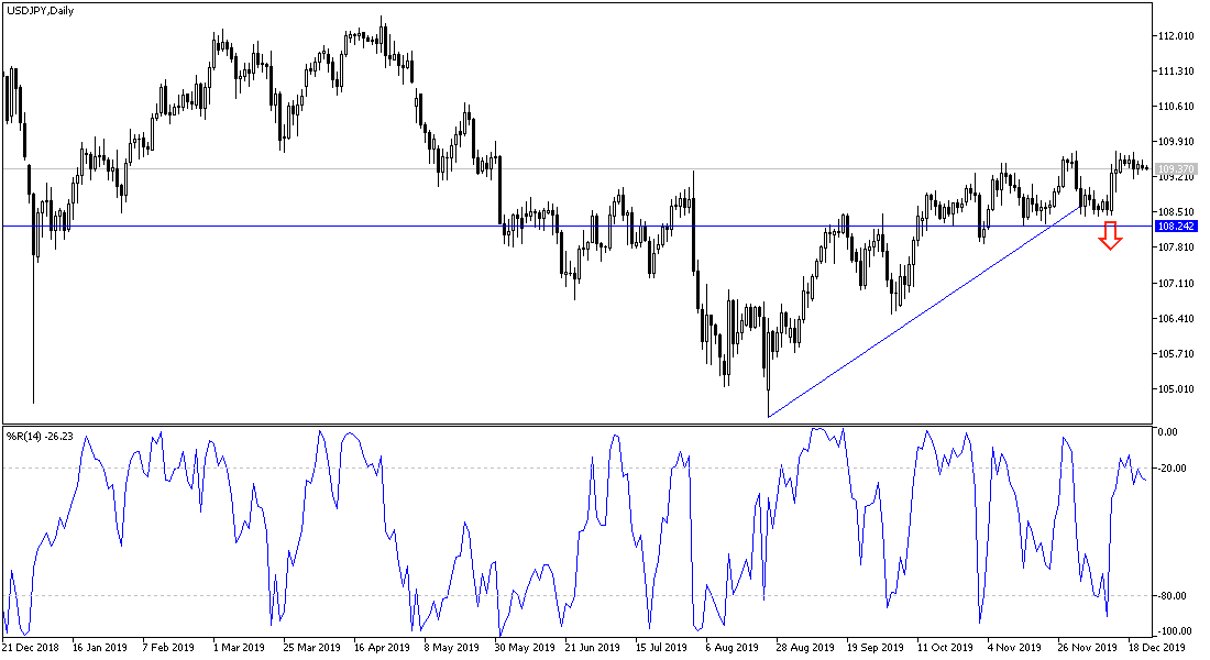 Poor performance of the USD/JPY with investors preparing for Christmas and New Year holidays. The pair is stable around 109.40, and there is no change in our technical point of view towards this pair, as the rally towards 110.00 psychological resistance will stimulate the current upward trend, and the 108.00 psychological support will remain key to the strength of the downtrend again. The daily chart below is the best guide. The pair’s recent performance foreshadows a strong movement ahead. The Japanese yen did not react much to China's recent announcement to cut more tariffs on US products. Beijing has adopted a series of measures to open markets and cut tariffs aimed at helping revive economic growth, which slowed to a three-decade low of 6% in the last quarter.