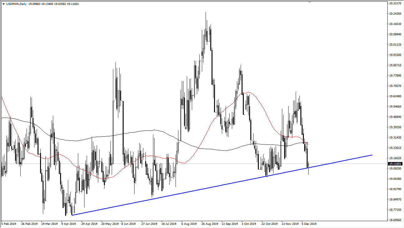The US dollar has been selling off against the Mexican peso due to this agreement obviously, but then the question becomes whether or not there is a general “risk on” attitude from a higher perspective when it comes to the markets. If we get issues over the weekend in the name of trade tariffs being extended on the Chinese, that might have a knock on effect over here and send a lot of money running from emerging markets. Regardless, due to the technical support in this area I am anticipating that the next move is probably higher. That being said, the highs continue to get lower so it’s very likely that signs of exhaustion will be sold into, but only if the market receives good news due to the trade agreement and/or something good coming out of the US/China trade situation. At this point, looking at this chart I think the one thing you can count on is a lot of choppy behavior. A breakdown below the lows of the trading session on Thursday would signify that perhaps we are ready to go towards the 18.50 pesos level, maybe even the 18 pesos level.
