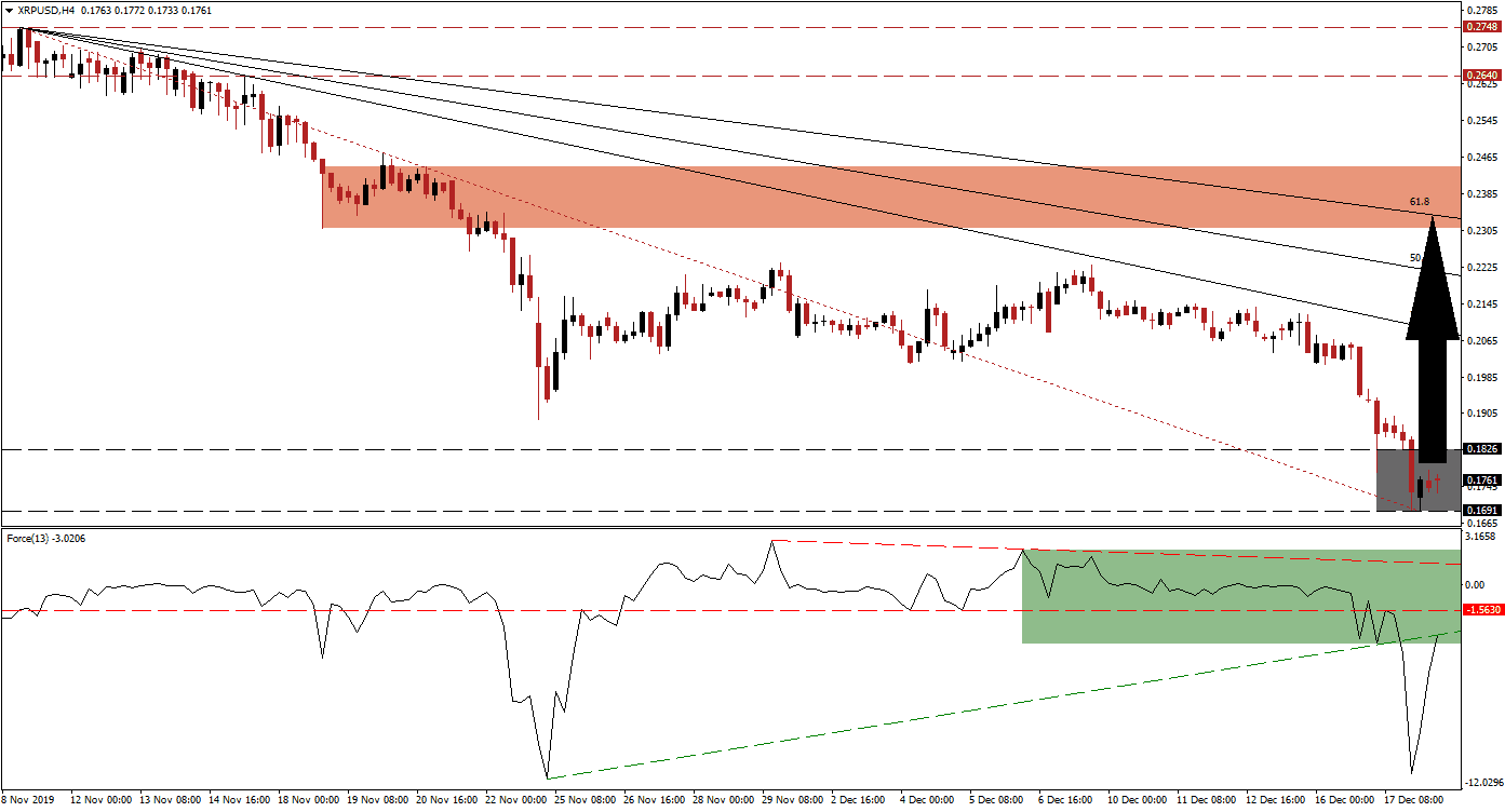 In case of a reversal in the Force Index, breakdown risks for the XRP/USD will increase. Given the extent of the sell-off to fundamental developments, the downside remains extremely limited. This cryptocurrency pair will reach its next support zone between 0.1270 and 0.1481 from where more downside would require a major catalyst. Spreading buy orders between both support zones remains the recommended approach.