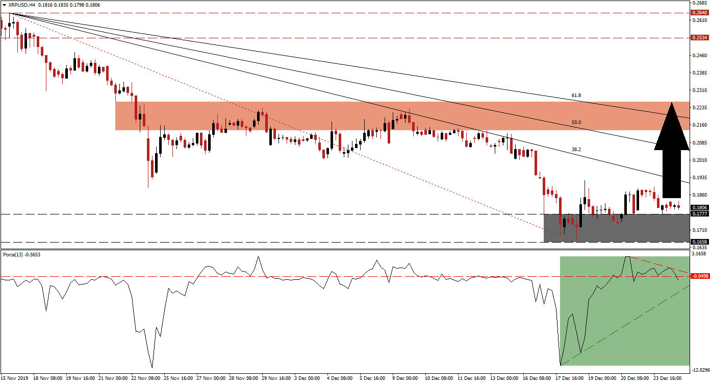 2020 will represent a key year for Ripple, and the XRP/USD is anticipated to capitalize on the bullish fundamentals. A breakout above its 38.2 Fibonacci Retracement Fan Resistance Level should take it into its short-term resistance zone located between 0.2137 and 0.2260, as marked by the red rectangle. The 61.8 Fibonacci Retracement Fan Resistance Level is currently nestled inside this zone, posing the first major resistance level for the anticipated price action recovery. A breakout is possible, which can extend an advance into its long-term resistance zone located between 0.2534 and 0.2640.