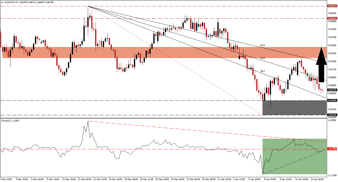 After this currency pair completed a breakout above its support zone located between 0.66205 and 0.66496, as marked by the grey rectangle, the downtrend was broken. Price action remains inside its descending Fibonacci Retracement Fan sequence, with the 38.2 Fibonacci Retracement Fan Support Level closing in on the top range of the support zone. With the pending increase in bullish momentum, the AUD/CHF is anticipated to eclipse its 50.0 Fibonacci Retracement Fan Resistance Level.