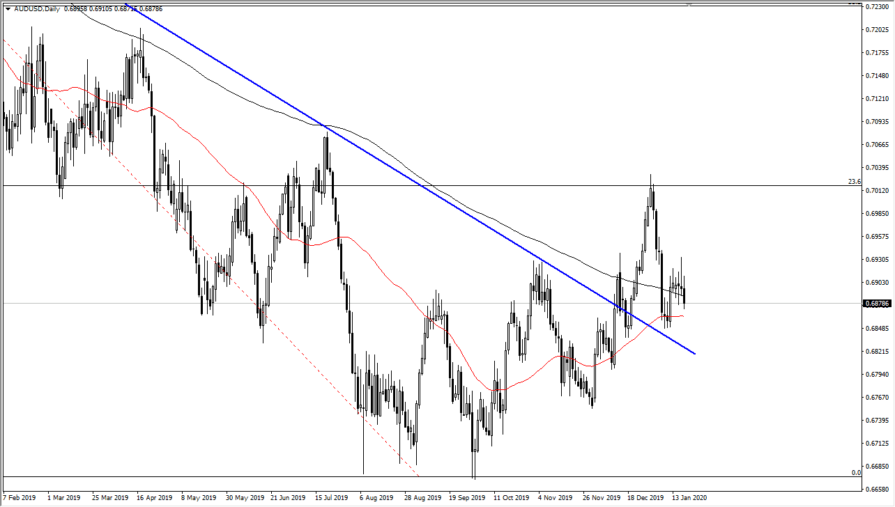 The Australian dollar has gone back and forth during the trading session on Friday but ended up forming a negative candlestick as we continue to dance around the 200 day EMA which of course is a large technical indicator. Furthermore, the 50 day EMA is coming in just below to turn things around, and it’s likely that we will see a lot of questions when it comes to the US/China trade relations. Granted, in the short term it looks like we are calming down and therefore it should by extension be good for the Australian currency.