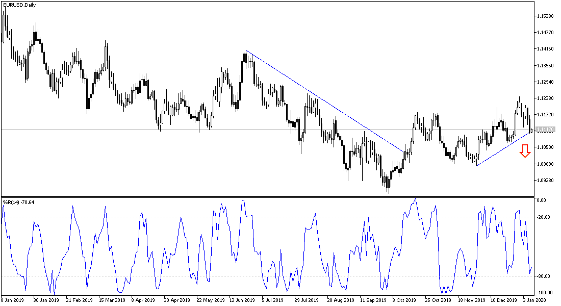 Throughout this week's trading, the EUR/USD price is moving within a downward correction that pushed the pair towards the 1.1108 support, as investors flee to buy the US dollar as a safe haven after the recent developments in the Middle East region. Fluctuations in the exchange rate of the Euro against the dollar increased over the past 24 hours, after the dollar rose sharply in response to some better-than-expected US data, and this resulted in a drop of EUR/USD by half a percent. Meanwhile, news of Iranian retaliation against the United States in the Middle East - with an attack on a US bases in Iraq - was met with little reaction in the Forex markets except for gold and crude oil.