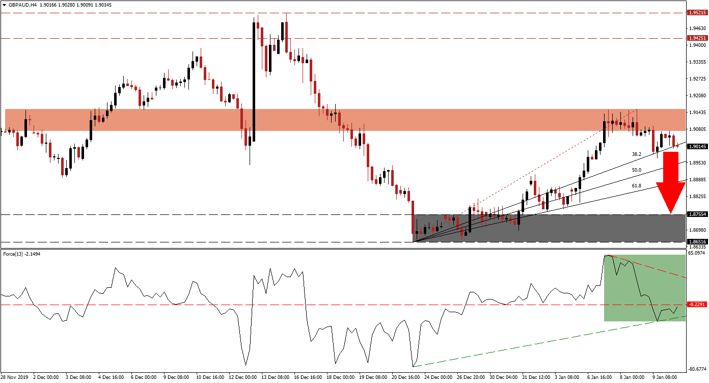 Forex traders are advised to monitor the intra-day low of 1.89696, the low of the breakdown in price action below its short-term resistance zone. A move below this level is anticipated to attract fresh net sell orders in the GBP/AUD. This should provide the necessary downside momentum to complete the breakdown sequence below its Fibonacci Retracement Fan. It will additionally clear the path for this currency pair to challenge the strength of its support zone located between 1.86516 and 1.87554, as marked by the grey rectangle.