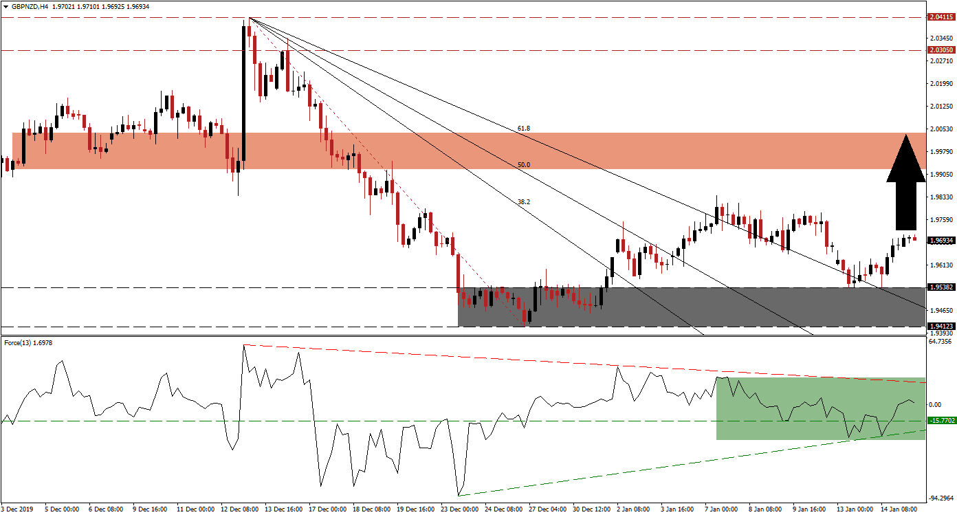 The Force Index, a next-generation technical indicator, indicates the rise in bullish momentum after the GBP/NZD pushed higher. The Force Index was able to recover after grazing its ascending support level, leading to a conversion of its horizontal resistance level into support. This technical indicator additionally advanced into positive conditions, placing bulls in charge of price action, as marked by the green rectangle. A breakout above its descending resistance level is favored to extend the advance in this currency pair.