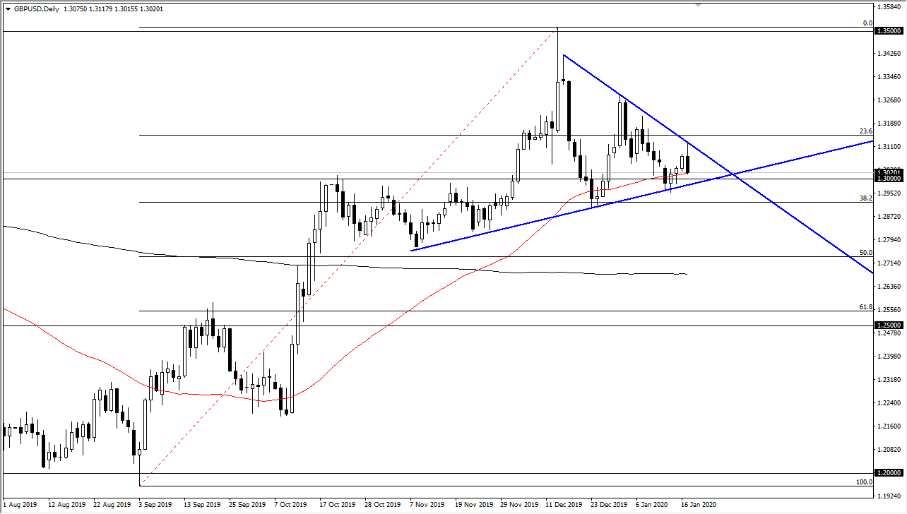 The British pound shows signs of choppiness going into the Monday session after the Friday retail sales figures were so soft. Looking at this chart, you can see there is a nice uptrend line underneath, so it’s likely that there will be a sense of support, not only from the uptrend line, but from the 1.30 level, and of course the 50 day EMA. That being said, this is a market that looks as if it is trying to tighten up and build up enough inertia to break in one direction or the other.