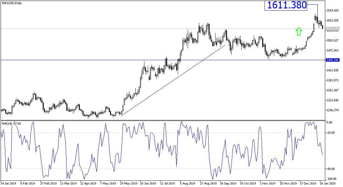 According to the technical analysis of gold: Despite the recent trading sessions in which gold prices retreated from their recent record gains, which are the highest for seven years, the general trend of the yellow metal will remain bullish as long as it is stable above the $1500 psychological resistance, and there will be no break of this trend without stability below this the level. At the present time, the closest levels of support for gold are 1535, 1520 and 1505, respectively. And the power of gold will not return again without renewed global trade and geopolitical tensions.