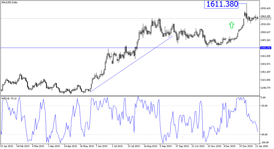 Gold prices witnessed fluctuation in performance during yesterday's session between the $1569 resistance and a rapid decline, reaching to the $1546 level of an ounce, but the price returned to stability around the $1560 resistance, after concern that prevailed in the global financial markets from the rapid spread of the Corona virus in China and the announcement of 6 deaths so far, and the number is likely to increase, despite the Chinese government's measures. China is an important market for the yellow metal, and at the same time, gold is extremely sensitive to renewed global trade and geopolitical tensions and an ideal safe haven for investors in times of uncertainty.