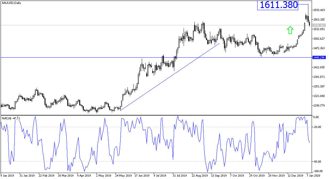 Despite the decline in Gold prices by more than 70 dollars, down to the $1540 level an ounce after record gains at the beginning of yesterday's session, pushing it to the $1612 resistance, its highest level in seven years, the trend is still bullish. The loss of these gains was supported by the appeasement statements by US President Trump on the missile attack by Iran on US bases in response to the US killing Qasim Soleimani, a prominent Iranian military commander, accused by the Trump administration of being primary responsible for harming American interests in the region.