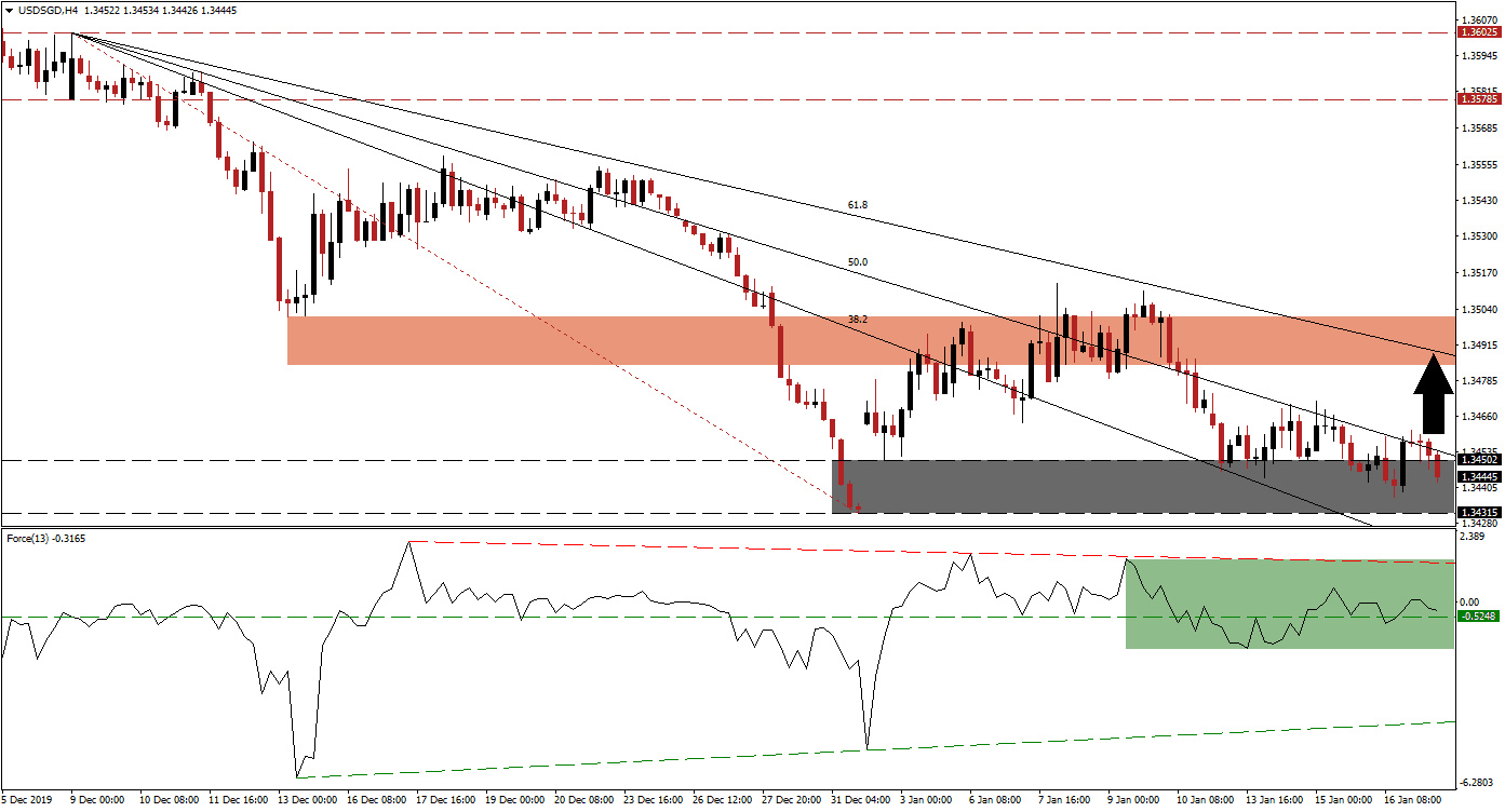 The Force Index, a next-generation technical indicator, maintains its current bullish stance and suggests this currency pair is vulnerable to a minor advance. After the Force Index converted its horizontal resistance level into support, as marked by the green rectangle, breakout pressures have increased. Bears have temporarily regained control of the USD/SGD after this technical indicator dipped into negative territory, but a bounce off of its horizontal support level is favored to push it into its descending resistance level. This is expected to guide price action to the upside.