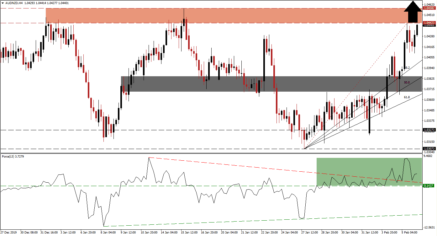 After this currency pair turned its short-term resistance zone into support, with an initially reversed breakout before accelerating to the upside, the Fibonacci Retracement Fan sequence was redrawn. This zone is located between 1.0368 and 1.03849, as marked by the grey rectangle. Since the Australian Dollar is the primary Chinese Yuan proxy currency, positive developments regarding the containment of the coronavirus provide a boost to the AUD/NZD. You can learn more about the Fibonacci Retracement Fan here.
