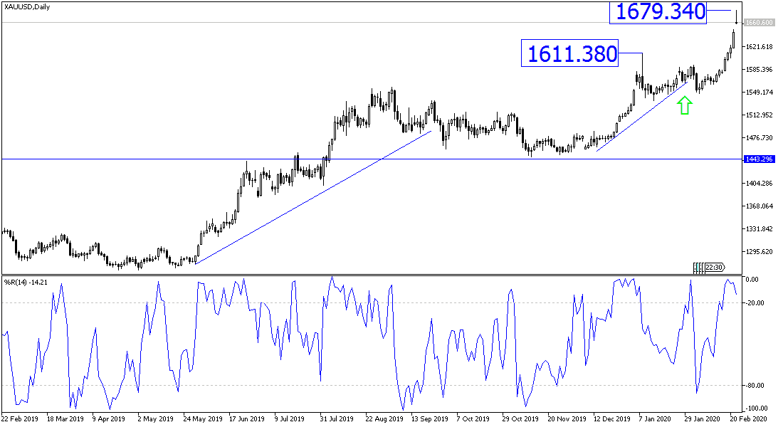 Larger and continuous losses caused by the Corona virus (Covid-19) = new historical and record gains for gold. The losses from China turned to Japan and South Korea, which paved the way for record and historical gains for gold prices that culminated by testing of the $1649 resistance, its highest level in seven years, before closing the week's trading around the $1643 level. At the beginning of this week’s trading, the price gapped higher towards $1679, before settling around $1662 at the time of writing. Forex traders wonder about the most appropriate level of selling, especially with the gold gains continuing without stopping. The answer depends on allaying global markets' concerns about the future of eradicating the epidemic that threatens global economic growth. The announcement of a vaccine that ends in the virus and that has already proven its efficacy, will be translated into violent gold sales, because the technical indicators have all reached strong overbought areas.