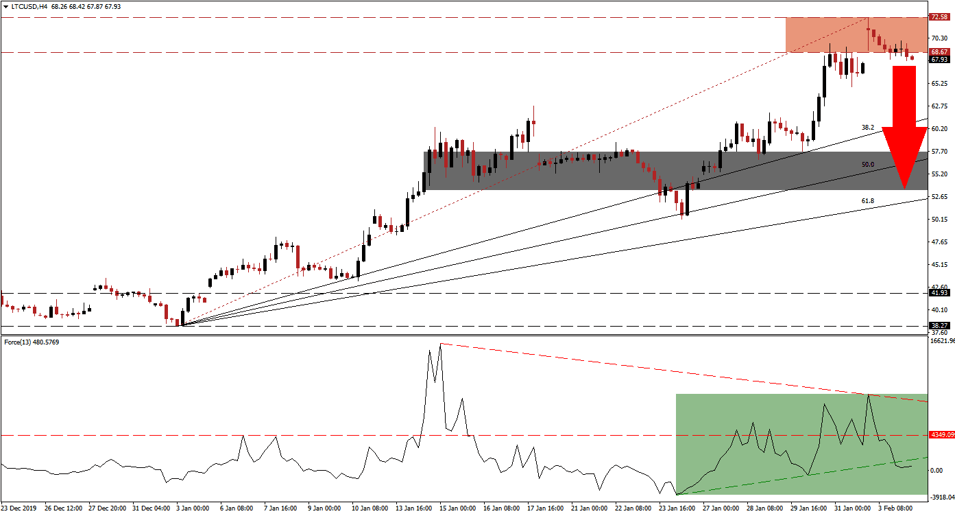 In case of a breakout in the Force Index above its descending resistance level, the LTC/USD is favored to follow suit. The fundamental outlook for this cryptocurrency pair remains increasingly bullish long-term, any short-term disruption should be considered a great buying opportunity, and expected to keep the bullish trend intact. A breakout will take price action into its next resistance zone, located between 79.79 and 86.02.
