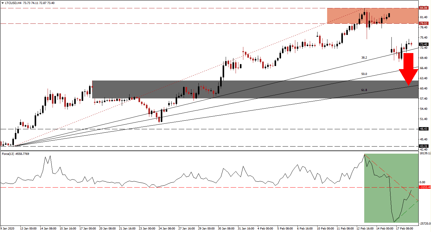 Price action provided traders an early warning sign after an initial breakdown below its resistance zone was reversed. The price gap emerged after a lower high inside this zone, located between 79.52 and 84.08, as marked by the red rectangle. This was followed by a temporary contraction in the LTC/USD below its ascending 38.2 Fibonacci Retracement Fan Support Level. A pause in the strong reversal is standard, but this cryptocurrency pair is well-positioned to extend farther to the downside from current levels. You can learn more about a price gap here.